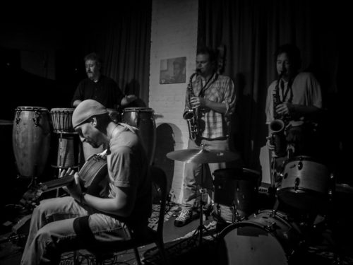 Percussionist/composer ADAM RUDOLPH and MARCO CAPPELLI met back in 2005 during  a John Zorn’s Improv Night at The Stone in NYC, here below fixed in a beautiful shot – with saxophonists Briggan Krauss (left) and John Zorn (right) – by photographer Peter Gannushkin.